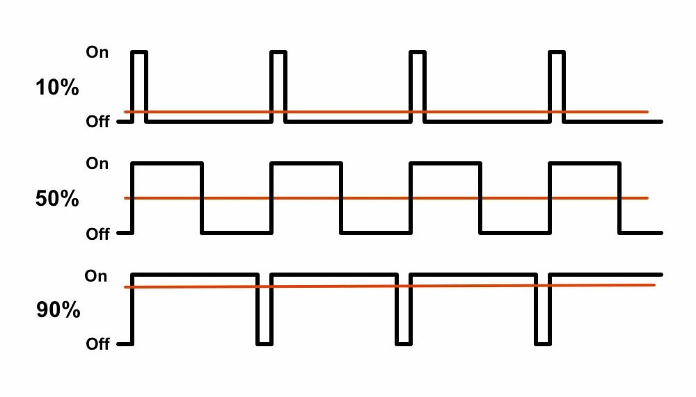 Pulse-Width Modulation is a method of reducing the average power delivered by an electrical signal, by effectively chopping it up into discrete parts. The average value of voltage (or current) fed to the load is controlled by turning the switch between supply and load on and off at a fast rate. The longer the switch is on compared to the off periods, the higher the total power supplied to the load.