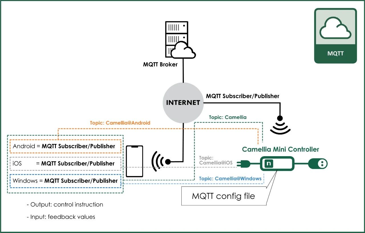 如果把手机、平板、电脑和 Camellia 嵌入式控制器设置在不同的局域网络中,即各自连接到不同的路由器。例如 Camellia 嵌入式控制器连接到家中的路由器,在数公里外的办公室中,手机、平板、电脑连接到办公室的路由器,两个路由器又同时连接到 Internet ,或是手机、平板、电脑直接通过 4G 或 5G 蜂窝通讯技术连接到 Internet ,就可以通过MQTT技术实现远程控制,这样无论你坐在办公室中,或是漫步在公园中,你都可以轻点手机,轻松操作在家中的安装了 Camellia 嵌入式控制器的机器人或智能设备,打造了自己的远程物联网络。