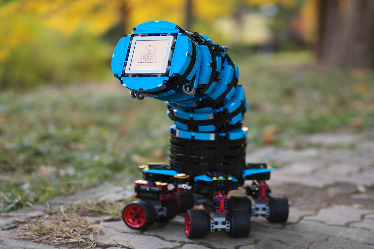 采用4部直流电机驱动4足车轮的转动,采用4部UART伺服舵机分别控制各个车轮的方向,机器人就地改变行进方向,实现近乎零的转弯半径。
