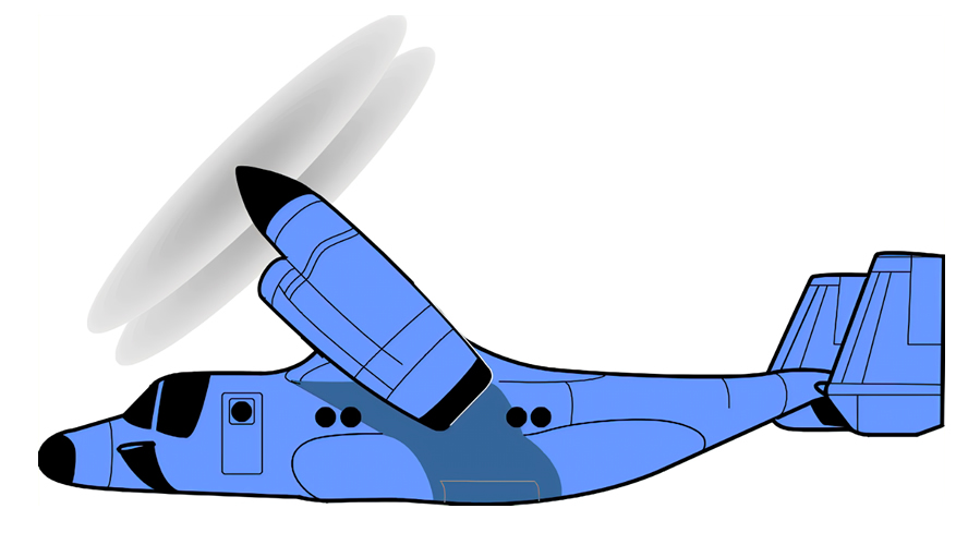 当螺旋桨平面向前方倾斜时,倾旋翼飞行器可以像固定翼飞机一样,产生向前的推进力。